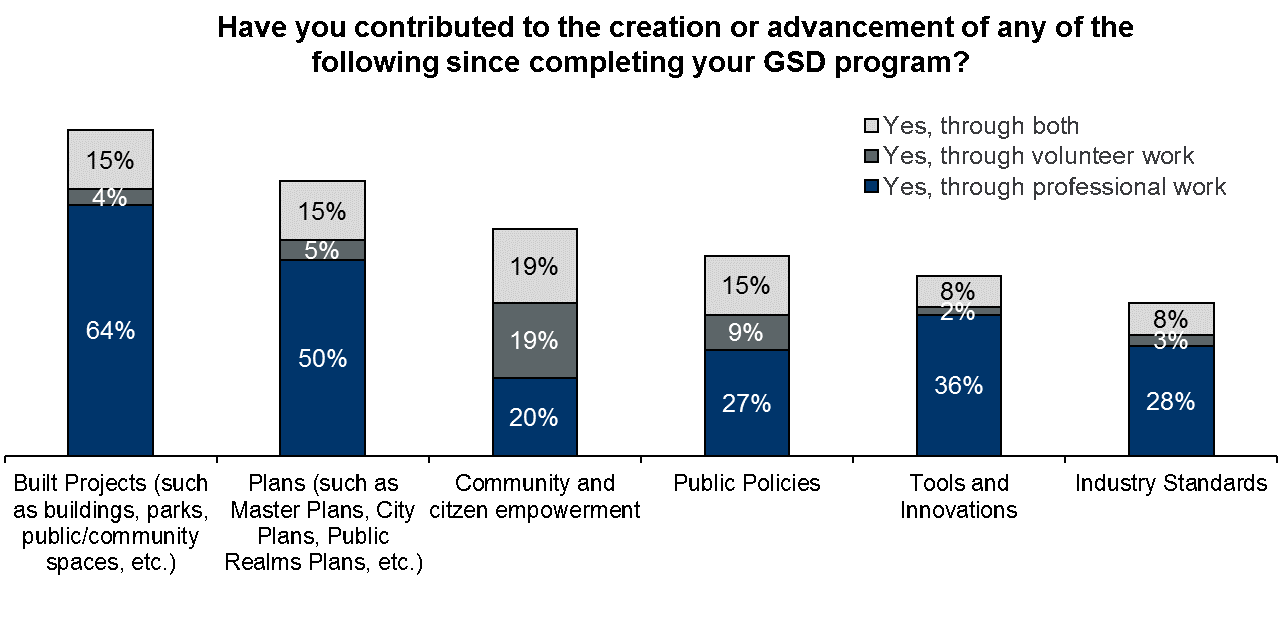 This survey of the lifelong community of multigenerational diverse design professionals indicates that with the knowledge and skills attained at the GSD, graduates are leaders and innovators in their fields of practice. Overall, alumni are highly productive in design and planning fields, with 83% creating built projects and 70% generating plans such as master plans and city plans in their professional lives or volunteer work.