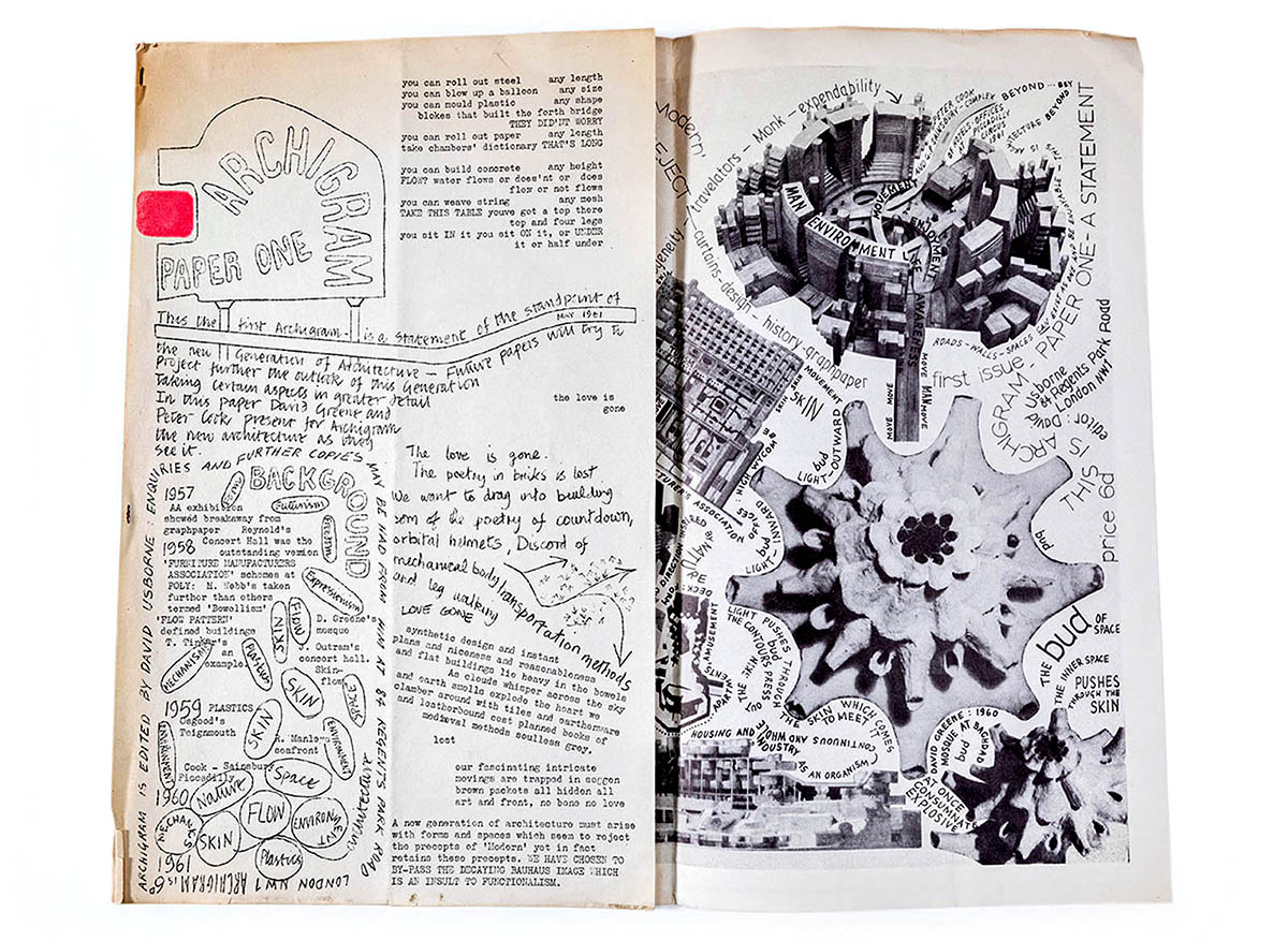 Imagine yourself a couple of months out of architecture school recalling the moments and projects that helped change your view of the world—a powerful exhibition, a design project that got your imagination going, the astounding work of your peers in studio, the big ideas you discussed, the small details you noticed. Put some of that together as an image-word collage on a sheet of letter paper; print 400 copies in somebody’s office; cut a potato to give each one a red stamp for color; staple it to another sheet presenting images of your group’s best projects. Then see if you can get everyone you know to buy a copy for about 75 cents. This is the unlikely beginning of Archigram, one of the most influential architectural publications of the 20th century.