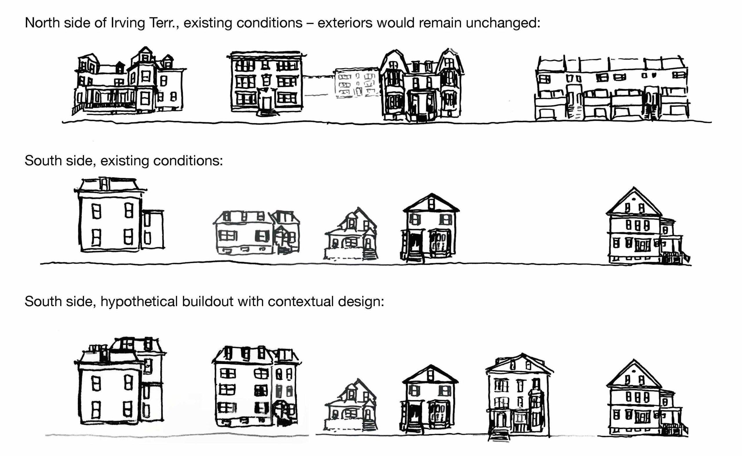 Drawings illustrating the potential and benign impact of the Overlay on Irving Terrace, which happens to be located next to Gund Hall. (Courtesy of Patrick Braga)