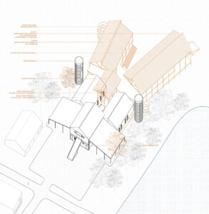 Consideration for the past also concerns cross-generational respect. Behling and Schmid’s plan facilitates formal and informal mentorships between farmers and students to support new generations of farmers. Programmatically, this takes the form of a farmer living on campus in the newly designed dormitories. Accessed from the boardwalk, these buildings utilize Southern vernacular forms, such as the shotgun house and the wraparound porch. “There’s an important lack of social and spatial hierarchy between the different spaces in the dormitories, with private bedrooms and shared spaces all connected through a procession of doors. There are no hallways,” explains Behling.