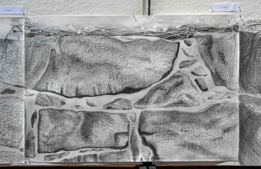 Spanning the length of Gund Hall’s sunny back patio stands a life-size black-and-white drawing of a stone wall, a cluster of students and critics squinting to assess its merits. This is the final review for Ewa Harabasz’s Graduate School of Design (GSD) course “Drawing for Designers 2, Human Presence: Appearance in Natural and Built Environments.” Students spent the semester observing closely and developing drawing techniques, capping off their work with the final collaborative stone wall project. Each student created a single frame 1:1 scale drawing on large sheets intended for watercolor—bumpy and uneven, creating more texture—which were then pieced together to create a continuous wall.