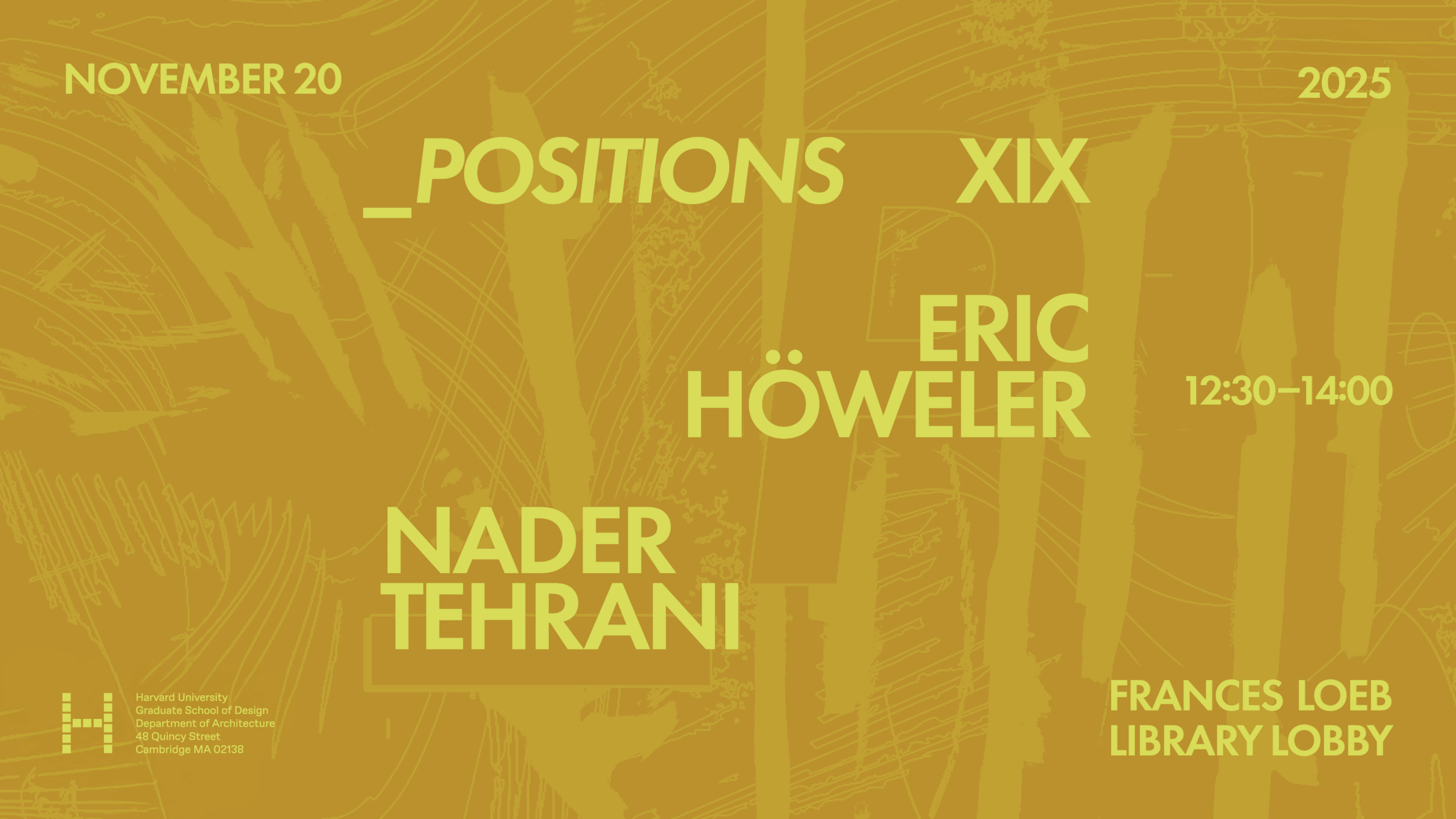 “_positions” is a series of conversations convened by the Department of Architecture at the Harvard University Graduate School of Design aimed at revealing the positions – temporary, relational, and self-conscious – taken by players on the field of contemporary architecture. Participating GSD faculty and invited guests are drawn from all facets of the discipline – architects, designers, historians, scholars, theorists, technologists, and those in other allied fields. The notion of relationality supersedes any fixed number of speakers. All speakers are asked to discharge the same task: share three projects that correspond to the development of your position over time.