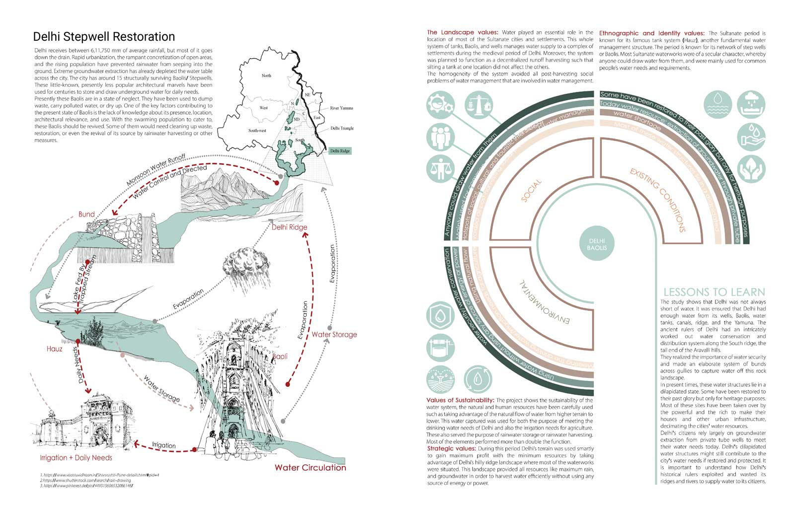 Baolis, or stepwells, are underground reservoirs where water can be stored close to the groundwater level to ensure a constant water supply during the dry season, one of two monsoon seasons across the Indian subcontinent. Baolis were first constructed as rock-cut stepwells between 200 and 400 AD to ensure water during periods of drought. While stepwells are utilitarian, they also have significant religious, social and cultural significance, and some have rooms built to provide shelters to caravans. The earthquake-proof construction and cool microclimate under the earth has made baolis a sanctuary for collecting water as well as bathing, meditation and prayers. Delhi has an estimated 32 stepwells, 16 lost or demolished, and 14 accessible to the public. Three of the baoli are permanently dry. The Indian National Trust for Art and Cultural Heritage began a project to de-silt and restore the 16 baoli that have not been lost, in an effort to bring back traditional means of water security and resilience against an increasingly erratic monsoon cycle that has deepened the water crisis across India, especially in urban centers like Delhi. To rehabilitate the stepwells, garbage and debris must first be removed, and then the stepwell must be desilted to reconnect the reservoir to the water table. In areas where there is significant unregulated pumping from wells, groundwater levels may be significantly below the lowest depths of the baoli, presenting a need for stewardship not only of the stepwell itself, but also equitable water policy for the surrounding areas to recharge groundwater.