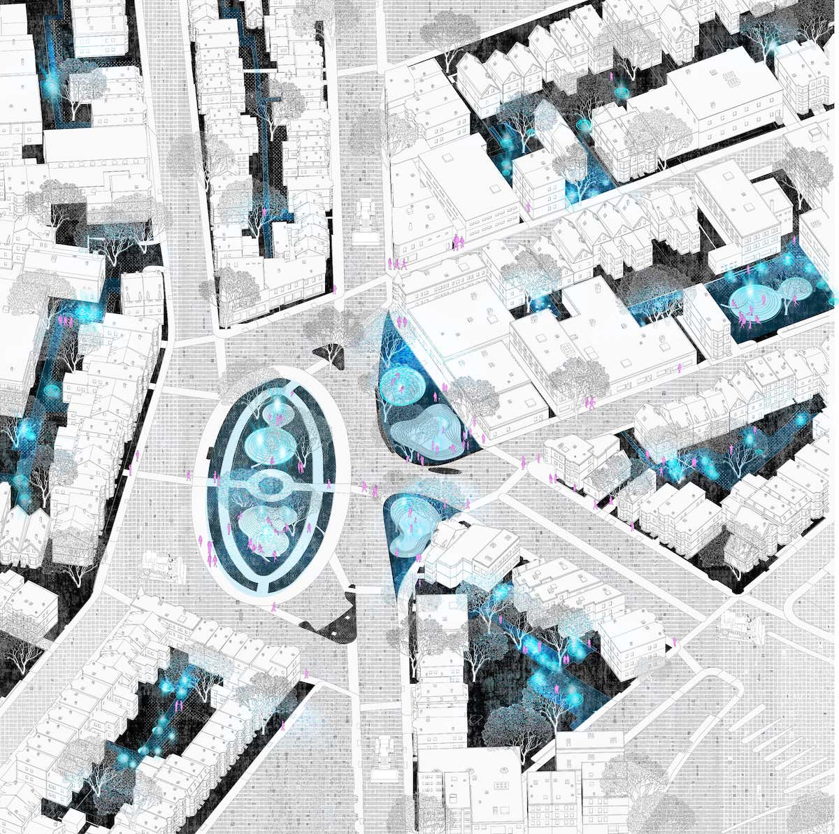 We seek to redefine the public commons through shared responsibility and redistribution of snow from a state of urban waste to one of valuable resource. Our team proposes an acupunctural network of snow storage inserted into the landscape that collect snow during cold seasons and emit cool air in the summer. The insertions correspond with above-surface landscapes that offer alternative spaces of public gathering and recreation. While each move is acupunctural, the larger effect becomes visible as a new shared commons emerges from the city fabric.