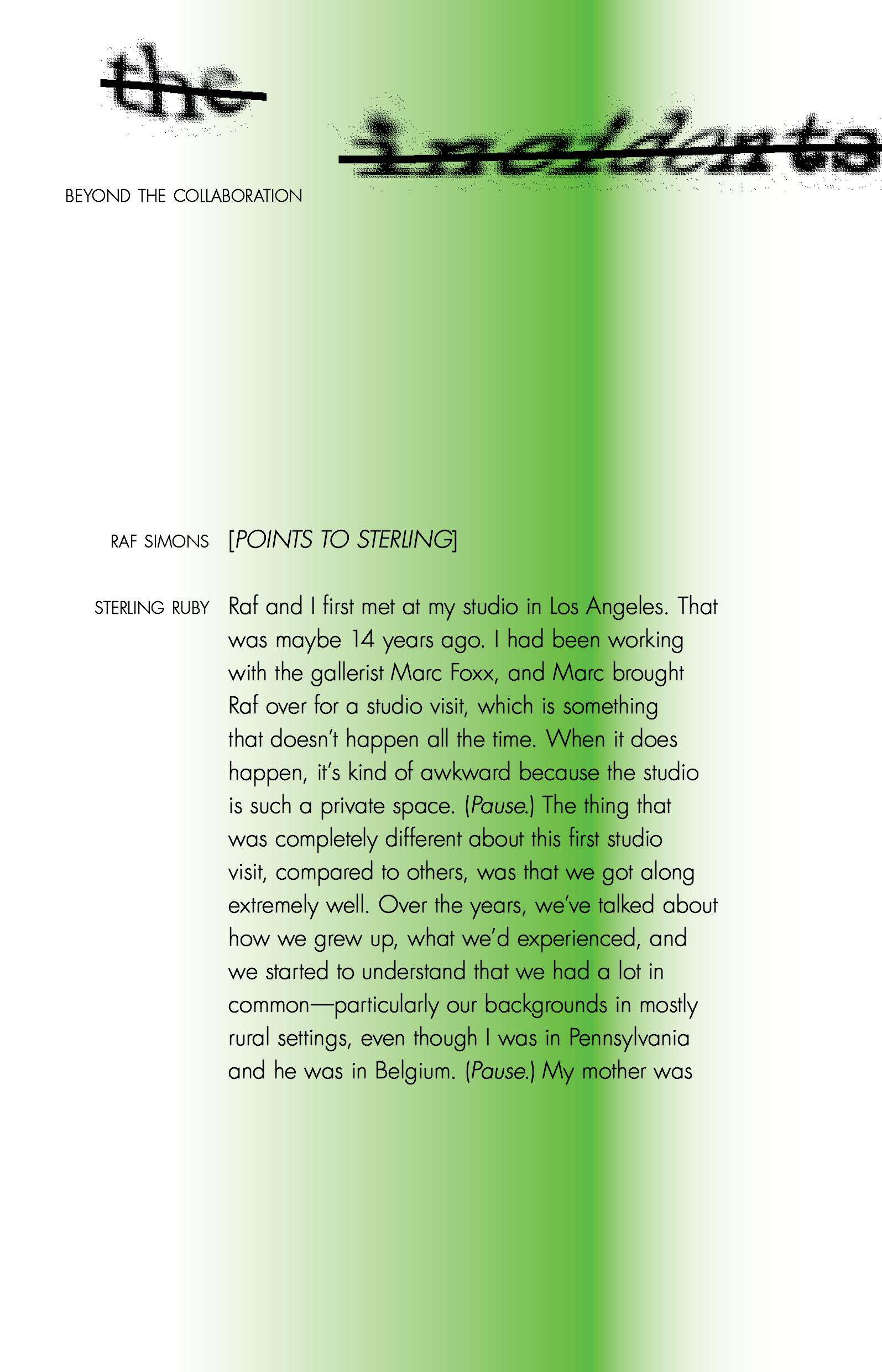 How do you tell the story of a friendship? How do you trace the roots of one of the most significant cross-disciplinary unions in fashion today? Artist Sterling Ruby and fashion designer Raf Simons did just that when they sat on stage with curator Jessica Morgan at the Harvard University Graduate School of Design. Offering complimentary perspectives on a bond that has matured over the span of a decade, and a body of work that transcends boundaries, Ruby and Simons spoke with mutual respect, trust, and a deep investment in the future. This is a story, and an exchange, that is beyond collaboration.