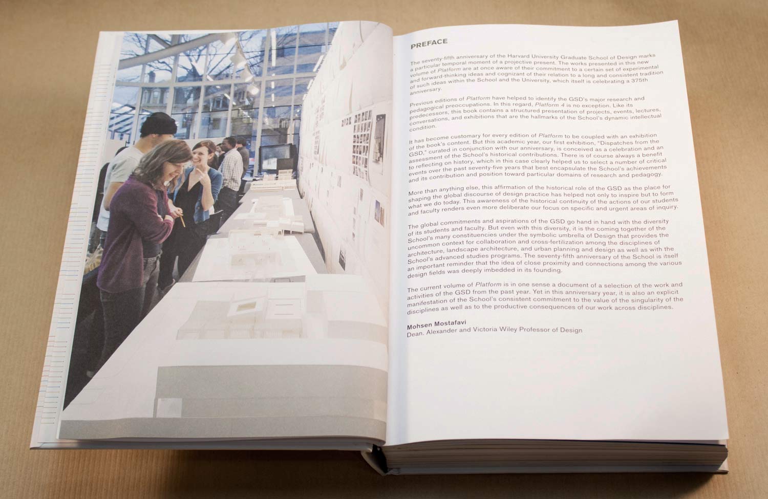 The fourth volume of a series, Platform 4 is more than a catalog of courses. It represents a selective sampling of the agendas at the GSD during the last academic year, revealing a diverse mixture of projects, research, and events. Platform 4 attempts to place the reader “at the scene.” On the steps of Piper auditorium when Jacques Herzog declared that, “architecture is like a love affair; it just is.” Or when Peter Eisenman, in conversation with Rafael Moneo, differentiated architects that “have a project” from those that “have a practice.” Platform 4 documents both site and situation at the GSD—it is an institutional index.